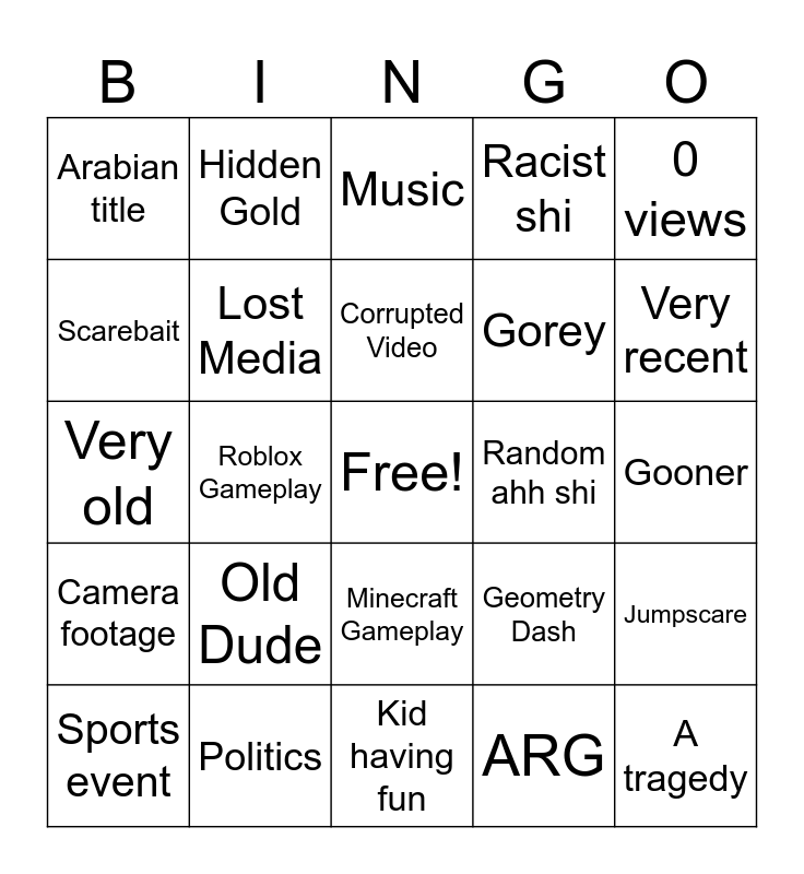 This bingo card has a free space and 24 words: Old Dude, Politics, Corrupted Video, Sports event, 0 views, Arabian title, Scarebait, Hidden Gold, Random ahh shi, Minecraft Gameplay, Gorey, Very old, Geometry Dash, Jumpscare, Lost Media, ARG, Gooner, Music, Very recent, Roblox Gameplay, A tragedy, Camera footage, Racist shi and Kid having fun.