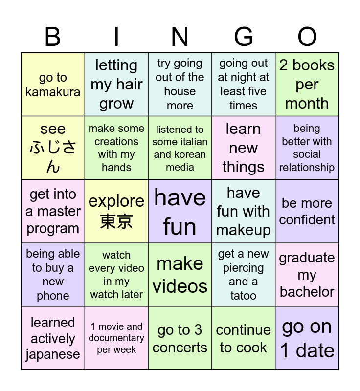 This bingo card has a free space and 24 words: watch every video in my watch later, 1 movie and documentary per week, listened to some italian and korean media, learned actively japanese, 2 books per month, go to kamakura, see ふじさん, letting my hair grow, have fun with makeup, make videos, learn new things, get into a master program, get a new piercing and a tatoo, graduate my bachelor, make some creations with my hands, continue to cook, be more confident, try going out of the house more, being better with social relationship, explore 東京, go on 1 date, being able to buy a new phone, going out at night at least five times and go to 3 concerts.