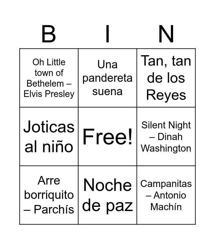 This bingo card has a free space and 63 words: Rodolfo el Reno, Blanca Navidad – La Oreja de Van Gogh, Navidad, Navidad – Luis Miguel, Feliz Navidad – Boney M, Canción para la Navidad – José Luis Perales, Alegría, alegría – Manu Tenorio, Una pandereta suena, Los campanilleros, Noche de paz, Ya vienen los Reyes Magos, Campana sobre campana – Raya Real, Ya viene la vieja, Adeste Fideles, Campanitas – Antonio Machín, Jingle Bells Rock – Bobby Helms, Silent Night – Dinah Washington, Santa Baby – Eartha Kitt, Oh Little town of Bethelem – Elvis Presley, Es de María – Los Secretos & Coro de Tajamar, Last Christmas – Wham!, Mas allá – Gloria Estefan, Happy XMas (War is over) – John Lennon & Yoko Ono, Joticas al niño, Ven a mi casa esta Navidad, All I want for Christmas is you – Mariah Carey, Llegó la Navidad – Ozuna & Generación Escogida, Trae pa’k esa yerba güena – Melendi, It’s beginning to look a lot like Christmas – Michael Bublé, Holly Joly Christmas – Michael Bublé, Es Navidad – Rosana, Las muñecas de Famosa, El tamborilero – Raphael, El burrito sabanero – David Bisbal, Sintonía Telepasión – Coro de RTVE, Rosie Christmas – Donna Summer, Palillos y panderos – Niña Pastori, 25 de diciembre fum, fum, fum, La Marimorena, El chiquirritín, Arre borriquito – Parchís, Hacia Belén va una burra, Todo es posible en Navidad – David Bisbal, Catatumba, Los peces en el río, A Belén, pastores, Dime, Niño, de quién eres, Canta, ríe, bebe, La Virgen va caminando, En el Portal de Belén, A la huella, a la huella, Ya es Navidad – Raya Real, Santa Claus llegó a la ciudad – Luis Miguel, Los pastores a Belén, Va a nevar – Luis Miguel, Villa & Ziko – Estopa, Tan, tan de los Reyes, Pastores, venid, Un año más – Mecano, Zúmbale al pandero, Soy un pobre pastorcito, Rumba de Navidad – Isabel Pantoja, Al Niño Manuel and Rockin’ around the Christmas Tree – Miley Cyrus.