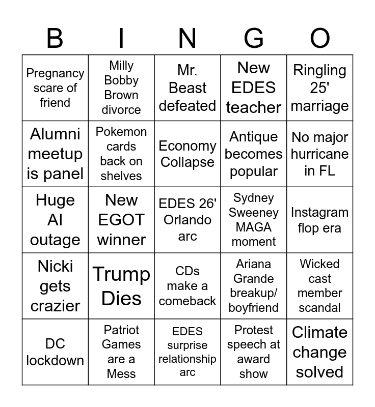 This bingo card has a free space and 24 words: Trump Dies, Patriot Games are a Mess, Economy Collapse, DC lockdown, Ringling 25' marriage, Pregnancy scare of friend, Alumni meetup is panel, Milly Bobby Brown divorce, Sydney Sweeney MAGA moment, CDs make a comeback, Antique becomes popular, Huge AI outage, Ariana Grande breakup/ boyfriend, Wicked cast member scandal, Pokemon cards back on shelves, Protest speech at award show, Instagram flop era, Mr. Beast defeated, No major hurricane in FL, New EGOT winner, Climate change solved, Nicki gets crazier, New EDES teacher and EDES surprise relationship arc.