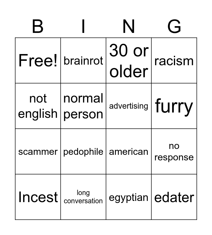 This bingo card has 16 words: Incest, long conversation, 30 or older, racism, not english, brainrot, american, no response, Free!, normal person, egyptian, furry, scammer, pedophile, advertising and edater.