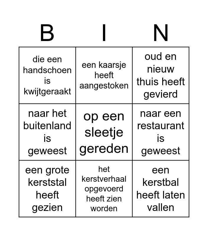 This bingo card has a free space and 34 words: naar een kerstmarkt is geweest, naar de kerk is geweest, kerstliedjes heeft gezongen, de kerstboom heeft opgetogen, niet de kerstboom heeft opgetogen, een grote kerststal heeft gezien, een kerstbal heeft laten vallen, gegourmet heeft, een kaarsje heeft aangestoken, een grote kerststal heeft gezien, het kerstverhaal opgevoerd heeft zien worden, oud en nieuw thuis heeft gevierd, oud en nieuw ergens anders heeft gevierd, oliebollen zonder krenten heeft gegeten, oliebollen met kreten heeft gegeten, vuurwerk heeft afgestoken, geen vuurwerk heeft afgestoken, naar een pretpark is geweest, een kerstfilm heeft gekeken .............., een boek heeft gelezen ............., een puzzel heeft gemaakt, een sneeuwpop heeft gemaakt, die een handschoen is kwijtgeraakt, die is gaan skiёn, die is gaan schaatsen, die bij een (haard)vuur zich heeft gewarmd, naar het buitenland is geweest, die warme chocolademelk heeft gedronken, zich chic heeft gekleed, naar een restaurant is geweest, naar familie is geweest, een kerststukje heeft gemaakt, van 10 naar 0 heeft afgeteld and cadeautjes heeft gekregen.