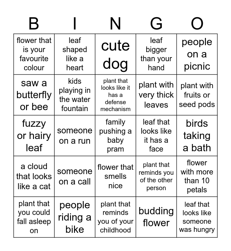 This bingo card has 25 words: someone on a call, plant that reminds you of your childhood, plant that looks like it has a defense mechanism, plant that you could fall asleep on, people on a picnic, flower that is your favourite colour, saw a butterfly or bee, leaf shaped like a heart, leaf that looks like it has a face, flower that smells nice, plant with very thick leaves, fuzzy or hairy leaf, plant that reminds you of the other person, flower with more than 10 petals, kids playing in the water fountain, leaf that looks like someone was hungry, birds taking a bath, cute dog, plant with fruits or seed pods, someone on a run, family pushing a baby pram, people riding a bike, a cloud that looks like a cat, leaf bigger than your hand and budding flower.