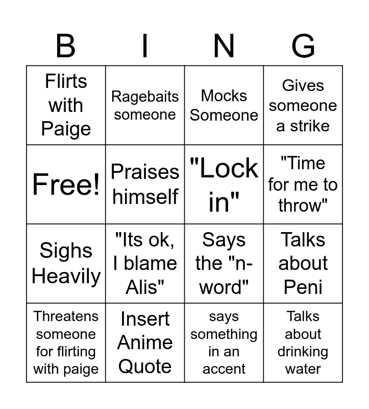 This bingo card has 16 words: Insert Anime Quote, Talks about Peni, Mocks Someone, Flirts with Paige, Sighs Heavily, Ragebaits someone, Says the "n-word", says something in an accent, Free!, Praises himself, Threatens someone for flirting with paige, Gives someone a strike, "Its ok, I blame Alis", "Time for me to throw", "Lock in" and Talks about drinking water.