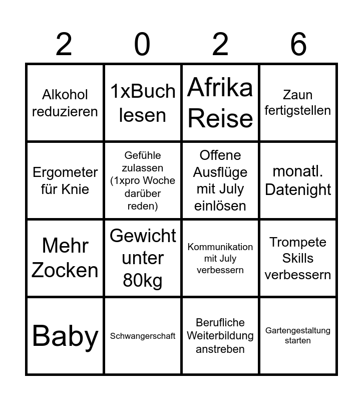 This bingo card has 16 words: Baby, Schwangerschaft, Afrika Reise, Zaun fertigstellen, Ergometer für Knie, 1xBuch lesen, Kommunikation mit July verbessern, Trompete Skills verbessern, Alkohol reduzieren, Gefühle zulassen (1xpro Woche darüber reden), Berufliche Weiterbildung anstreben, monatl. Datenight, Mehr Zocken, Gewicht unter 80kg, Offene Ausflüge mit July einlösen and Gartengestaltung starten.