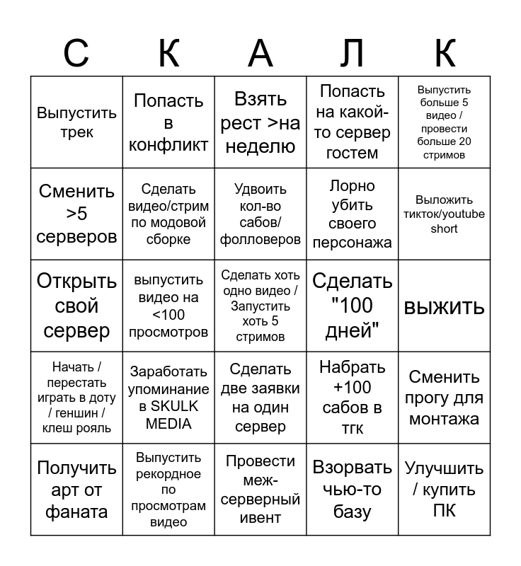 This bingo card has a free space and 24 words: Заработать упоминание в SKULK MEDIA, Выпустить рекордное по просмотрам видео, Удвоить кол-во сабов/фолловеров, Получить арт от фаната, Выпустить больше 5 видео / провести больше 20 стримов, Выпустить трек, Сменить >5 серверов, Попасть в конфликт, Сделать "100 дней", Сделать две заявки на один сервер, Лорно убить своего персонажа, Открыть свой сервер, Набрать +100 сабов в тгк, Сменить прогу для монтажа, Сделать видео/стрим по модовой сборке, Взорвать чью-то базу, выжить, Взять рест >на неделю, Выложить тикток/youtube short, выпустить видео на <100 просмотров, Улучшить / купить ПК, Начать / перестать играть в доту / геншин / клеш рояль, Попасть на какой-то сервер гостем and Провести меж-серверный ивент.
