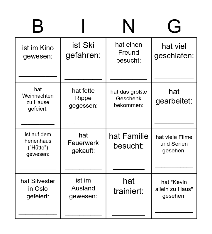 This bingo card has 16 words: ist im Ausland gewesen: __________, hat viele Filme und Serien gesehen: ____________, hat einen Freund besucht: __________, ist im Kino gewesen: __________, ist auf dem Ferienhaus ("Hütte") gewesen: ____________, ist Ski gefahren: ________, hat Familie besucht: _______, hat trainiert: _______, hat Weihnachten zu Hause gefeiert: ___________, hat fette Rippe gegessen: ___________, hat Silvester in Oslo gefeiert: ___________, hat viel geschlafen: _________, hat Feuerwerk gekauft: __________, hat gearbeitet: _________, hat das größte Geschenk bekommen: ____________ and hat "Kevin allein zu Haus" gesehen: ____________.