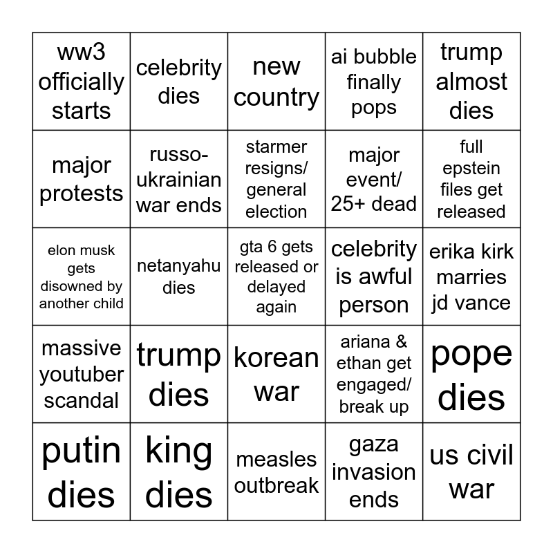 This bingo card has a free space and 24 words: trump dies, king dies, starmer resigns/ general election, putin dies, trump almost dies, ww3 officially starts, major protests, celebrity dies, celebrity is awful person, korean war, major event/ 25+ dead, elon musk gets disowned by another child, ariana & ethan get engaged/ break up, pope dies, russo-ukrainian war ends, gaza invasion ends, erika kirk marries jd vance, new country, full epstein files get released, netanyahu dies, us civil war, massive youtuber scandal, ai bubble finally pops and measles outbreak.