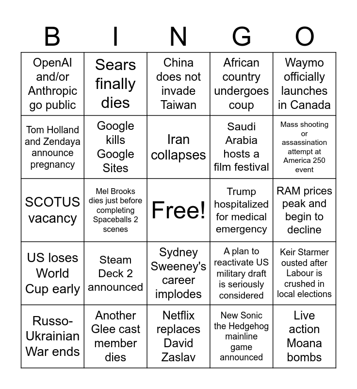 This bingo card has a free space and 24 words: Steam Deck 2 announced, Another Glee cast member dies, Iran collapses, Russo-Ukrainian War ends, Waymo officially launches in Canada, OpenAI and/or Anthropic go public, Tom Holland and Zendaya announce pregnancy, Sears finally dies, Trump hospitalized for medical emergency, Sydney Sweeney's career implodes, Saudi Arabia hosts a film festival, SCOTUS vacancy, A plan to reactivate US military draft is seriously considered, Keir Starmer ousted after Labour is crushed in local elections, Google kills Google Sites, New Sonic the Hedgehog mainline game announced, RAM prices peak and begin to decline, China does not invade Taiwan, Mass shooting or assassination attempt at America 250 event, Mel Brooks dies just before completing Spaceballs 2 scenes, Live action Moana bombs, US loses World Cup early, African country undergoes coup and Netflix replaces David Zaslav.