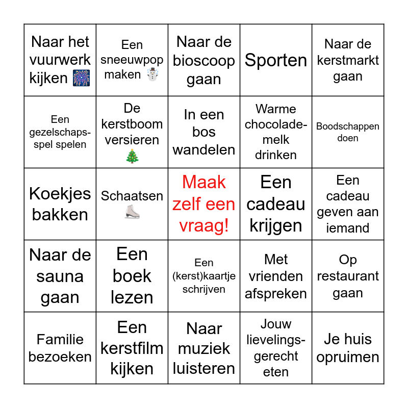 This bingo card has a free space and 24 words: Een boek lezen, Een kerstfilm kijken, In een bos wandelen, Familie bezoeken, Naar de kerstmarkt gaan, Naar het vuurwerk kijken π, Een gezelschaps-spel spelen, Een sneeuwpop maken βοΈ, Een cadeau krijgen, Een (kerst)kaartje schrijven, Warme chocolade-melk drinken, Koekjes bakken, Met vrienden afspreken, Op restaurant gaan, De kerstboom versieren π, Jouw lievelings-gerecht eten, Een cadeau geven aan iemand, Naar de bioscoop gaan, Boodschappen doen, Schaatsen βΈοΈ, Je huis opruimen, Naar de sauna gaan, Sporten and Naar muziek luisteren.