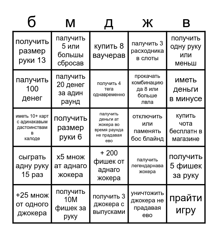 This bingo card has 25 words: х5 множ ат аднаго жокера, получить 3 джокера с выпусками, получить 4 тега однавременно, +25 множ от одного джокера, получить одну руку или меньш, получить размер руки 13, палучить 100 денег, палучить 5 или большы сбросав, отключить или паменять бос блайнд, + 200 фишек от аднаго жокера, прокачать комбинацию да 8 или больше лвла, иметь 10+ карт с адинакавым дастоинствам в калоде, палучить легендарнава жокера, получить 5 фишек за руку, палучить 20 денег за адин раунд, прайти игру, купить чота бесплатн в магазине, купить 8 ваучерав, иметь деньги в минусе, получить размер руки 6, палучить деньги ат жокера во время раунда не прадавая ево, получить 10М фишек за руку, сыграть адну руку 15 раз, палучить 3 расходника в слоты and уничтожить джокера не прадавая ево.