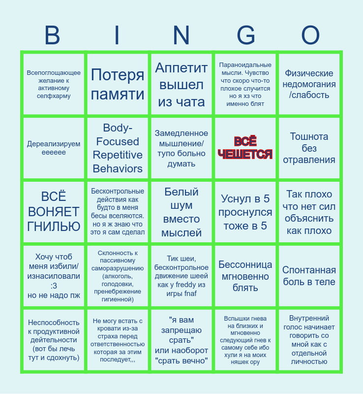This bingo card has a free space and 24 words: Склонность к пассивному саморазрушению (алкоголь, голодовки, пренебрежение гигиенной), Не могу встать с кровати из-за страха перед ответственностью которая за этим последует,,,, Замедленное мышление/тупо больно думать, Неспособность к продуктивной дейтельности (вот бы лечь тут и сдохнуть), Физические недомогания /слабость, Всепоглощающее желание к активному селфхарму, Дереализируем ееееее, Потеря памяти, Уснул в 5 проснулся тоже в 5, Тик шеи, бесконтрольное движение шеей как у freddy из игры fnaf, ВСЁ ЧЕШЕТСЯ, ВСЁ ВОНЯЕТ ГНИЛЬЮ, Бессонница мгновенно блять, Спонтанная боль в теле, Body-Focused Repetitive Behaviors, Вспышки гнева на близких и мгновенно следующий гнев к самому себе ибо хули я на моих няшек ору, Так плохо что нет сил объяснить как плохо, Аппетит вышел из чата, Тошнота без отравления, Бесконтрольные действия как будто в меня бесы вселяются. но я ж знаю что это я сам сделал, Внутренний голос начинает говорить со мной как с отдельной личностью, Хочу чтоб меня избили/изнасиловали :3 но не надо пж, Параноидальные мысли. Чувство что скоро что-то плохое случится но я хз что именно блят and "я вам запрещаю срать" или наоборот "срать вечно".