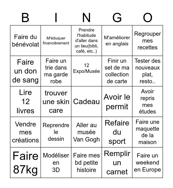 This bingo card has a free space and 24 words: Reprendre le dessin, Modéliser en 3D, 12 Expo/Musée, Faire 87kg, Regrouper mes recettes, Faire du bénévolat, Faire un don de sang, M'éduquer financièrement, Avoir le permit, Aller au musée Van Gogh, Finir un set de ma collection de carte, Lire 12 livres, Refaire du sport, Faire une maquette de la maison, Faire un trie dans ma garde robe, Remplir un carnet, Avoir repris mes études, Prendre l'habitude d'aller dans un lieu(bibli, café, etc..), Tester des nouveaux plat, resto.., trouver une skin care, Faire un weekend en Europe, Vendre mes créations, M'améliorer en anglais and Faire mes bd petite histoire.
