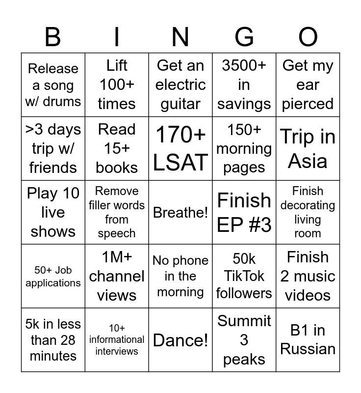This bingo card has a free space and 24 words: 1M+ channel views, 10+ informational interviews, 170+ LSAT, 5k in less than 28 minutes, Get my ear pierced, Release a song w/ drums, >3 days trip w/ friends, Lift 100+ times, Finish EP #3, No phone in the morning, 150+ morning pages, Play 10 live shows, 50k TikTok followers, Finish 2 music videos, Read 15+ books, Summit 3 peaks, Finish decorating living room, Get an electric guitar, Trip in Asia, Remove filler words from speech, B1 in Russian, 50+ Job applications, 3500+ in savings and Dance!.