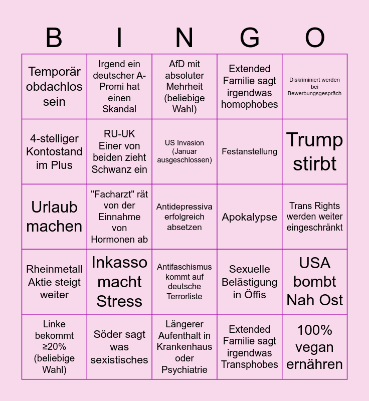 This bingo card has 25 words: Inkasso macht Stress, Längerer Aufenthalt in Krankenhaus oder Psychiatrie, US Invasion (Januar ausgeschlossen), Linke bekommt ≥20% (beliebige Wahl), Diskriminiert werden bei Bewerbungsgespräch, Temporär obdachlos sein, 4-stelliger Kontostand im Plus, Irgend ein deutscher A-Promi hat einen Skandal, Apokalypse, Antifaschismus kommt auf deutsche Terrorliste, Festanstellung, Urlaub machen, Sexuelle Belästigung in Öffis, USA bombt Nah Ost, RU-UK Einer von beiden zieht Schwanz ein, 100% vegan ernähren, Trans Rights werden weiter eingeschränkt, AfD mit absoluter Mehrheit (beliebige Wahl), Trump stirbt, "Facharzt" rät von der Einnahme von Hormonen ab, Antidepressiva erfolgreich absetzen, Söder sagt was sexistisches, Rheinmetall Aktie steigt weiter, Extended Familie sagt irgendwas homophobes and Extended Familie sagt irgendwas Transphobes.