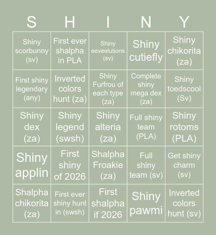 This bingo card has 25 words: First shiny of 2026, First shalpha if 2026, Shiny Furfrou of each type (za), Shalpha chikorita (za), Shiny chikorita (za), Shiny scorbunny (sv), First shiny legendary (any), First ever shalpha in PLA, Full shiny team (PLA), Shalpha Froakie (za), Complete shiny mega dex (za), Shiny dex (za), Full shiny team (sv), Get shiny charm (sv), Inverted colors hunt (za), Inverted colors hunt (sv), Shiny rotoms (PLA), Shiny eeveelutions (sv), Shiny toedscool (Sv), Shiny legend (swsh), Shiny alteria (za), First ever shiny hunt in (swsh), Shiny applin, Shiny cutiefly and Shiny pawmi.