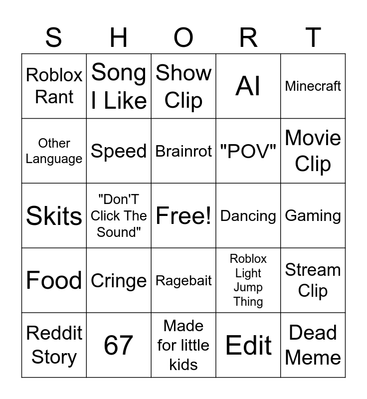 This bingo card has a free space and 24 words: Cringe, 67, Brainrot, Reddit Story, Minecraft, Roblox Rant, Other Language, Song I Like, Dancing, Ragebait, "POV", Skits, Roblox Light Jump Thing, Stream Clip, Speed, Edit, Gaming, Show Clip, Movie Clip, "Don'T Click The Sound", Dead Meme, Food, AI and Made for little kids.
