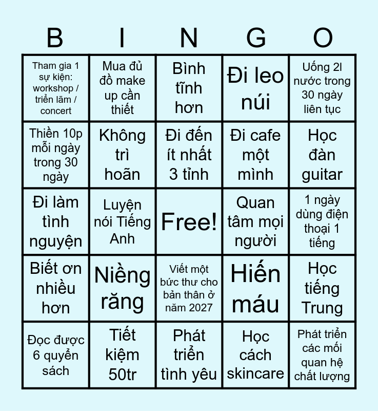 This bingo card has a free space and 24 words: Niềng răng, Tiết kiệm 50tr, Đi đến ít nhất 3 tỉnh, Đọc được 6 quyển sách, Uống 2l nước trong 30 ngày liên tục, Tham gia 1 sự kiện: workshop / triển lãm / concert, Thiền 10p mỗi ngày trong 30 ngày, Mua đủ đồ make up cần thiết, Quan tâm mọi người, Viết một bức thư cho bản thân ở năm 2027, Đi cafe một mình, Đi làm tình nguyện, Hiến máu, Học tiếng Trung, Không trì hoãn, Học cách skincare, 1 ngày dùng điện thoại 1 tiếng, Bình tĩnh hơn, Học đàn guitar, Luyện nói Tiếng Anh, Phát triển các mối quan hệ chất lượng, Biết ơn nhiều hơn, Đi leo núi and Phát triển tình yêu.
