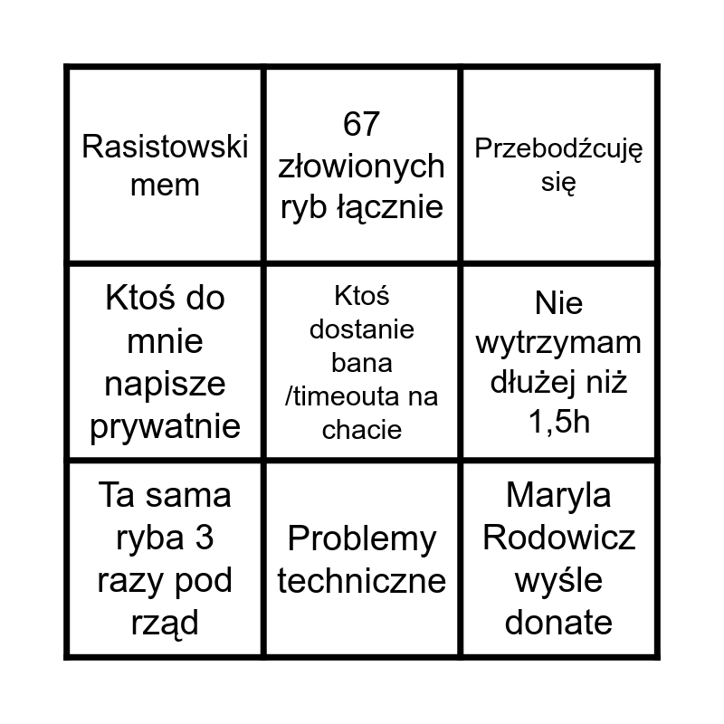 This bingo card has 9 words: Ta sama ryba 3 razy pod rząd, Przebodźcuję się, 67 złowionych ryb łącznie, Ktoś do mnie napisze prywatnie, Rasistowski mem, Nie wytrzymam dłużej niż 1,5h, Ktoś dostanie bana /timeouta na chacie, Maryla Rodowicz wyśle donate and Problemy techniczne.