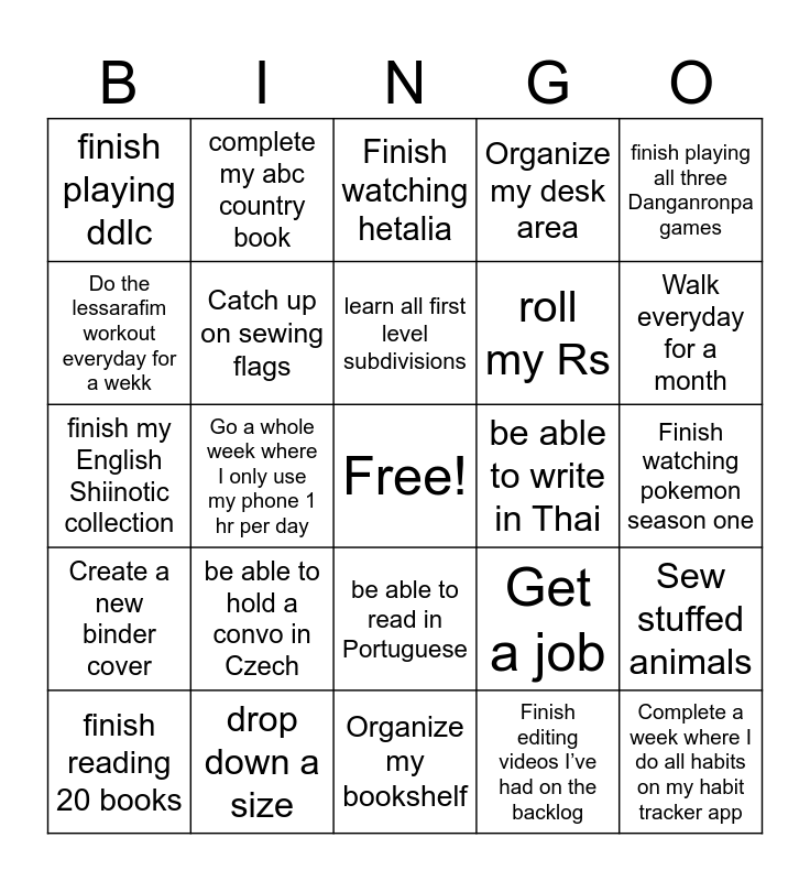 This bingo card has a free space and 24 words: be able to hold a convo in Czech, drop down a size, learn all first level subdivisions, finish reading 20 books, finish playing all three Danganronpa games, finish playing ddlc, Do the lessarafim workout everyday for a wekk, complete my abc country book, be able to write in Thai, be able to read in Portuguese, roll my Rs, finish my English Shiinotic collection, Get a job, Sew stuffed animals, Catch up on sewing flags, Finish editing videos I’ve had on the backlog, Finish watching pokemon season one, Finish watching hetalia, Walk everyday for a month, Go a whole week where I only use my phone 1 hr per day, Complete a week where I do all habits on my habit tracker app, Create a new binder cover, Organize my desk area and Organize my bookshelf.