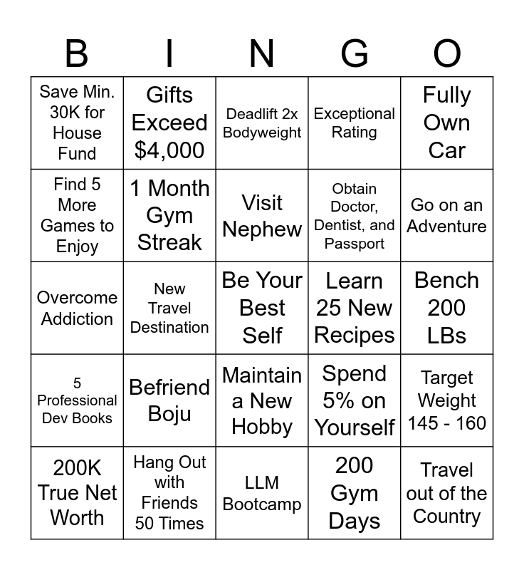 This bingo card has a free space and 24 words: Befriend Boju, Hang Out with Friends 50 Times, Visit Nephew, 200K True Net Worth, Fully Own Car, Save Min. 30K for House Fund, Find 5 More Games to Enjoy, Gifts Exceed $4,000, Learn 25 New Recipes, Maintain a New Hobby, Obtain Doctor, Dentist, and Passport, Overcome Addiction, Spend 5% on Yourself, Target Weight 145 - 160, 1 Month Gym Streak, 200 Gym Days, Bench 200 LBs, Deadlift 2x Bodyweight, Go on an Adventure, New Travel Destination, Travel out of the Country, 5 Professional Dev Books, Exceptional Rating and LLM Bootcamp.