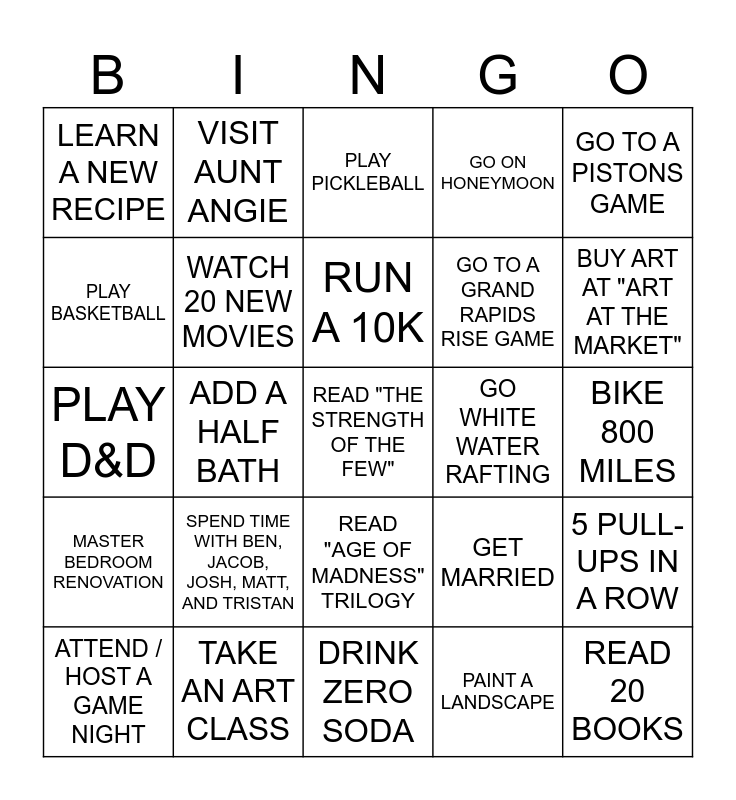 This bingo card has 25 words: SPEND TIME WITH BEN, JACOB, JOSH, MATT, AND TRISTAN, DRINK ZERO SODA, RUN A 10K, ATTEND / HOST A GAME NIGHT, GO TO A PISTONS GAME, LEARN A NEW RECIPE, PLAY BASKETBALL, VISIT AUNT ANGIE, GO WHITE WATER RAFTING, READ "AGE OF MADNESS" TRILOGY, GO TO A GRAND RAPIDS RISE GAME, PLAY D&D, GET MARRIED, 5 PULL-UPS IN A ROW, WATCH 20 NEW MOVIES, READ 20 BOOKS, BIKE 800 MILES, PLAY PICKLEBALL, BUY ART AT "ART AT THE MARKET", ADD A HALF BATH, READ "THE STRENGTH OF THE FEW", TAKE AN ART CLASS, MASTER BEDROOM RENOVATION, GO ON HONEYMOON and PAINT A LANDSCAPE.