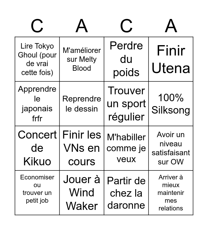This bingo card has 16 words: Jouer à Wind Waker, Avoir un niveau satisfaisant sur OW, Perdre du poids, Lire Tokyo Ghoul (pour de vrai cette fois), Concert de Kikuo, M'améliorer sur Melty Blood, M'habiller comme je veux, Partir de chez la daronne, Apprendre le japonais frfr, Reprendre le dessin, Economiser ou trouver un petit job, Finir Utena, Finir les VNs en cours, 100% Silksong, Trouver un sport régulier and Arriver à mieux maintenir mes relations.
