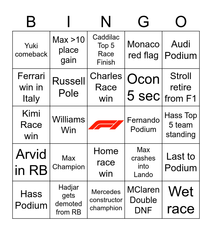 This bingo card has a free space and 24 words: Hass Podium, Max Champion, Charles Race win, MClaren Double DNF, Audi Podium, Yuki comeback, Max >10 place gain, Caddilac Top 5 Race Finish, Fernando Podium, Hass Top 5 team standing, Kimi Race win, Russell Pole, Max crashes into Lando, Last to Podium, Ferrari win in Italy, Hadjar gets demoted from RB, Mercedes constructor champhion, Monaco red flag, Stroll retire from F1, Arvid in RB, Williams Win, Home race win, Ocon 5 sec and Wet race.