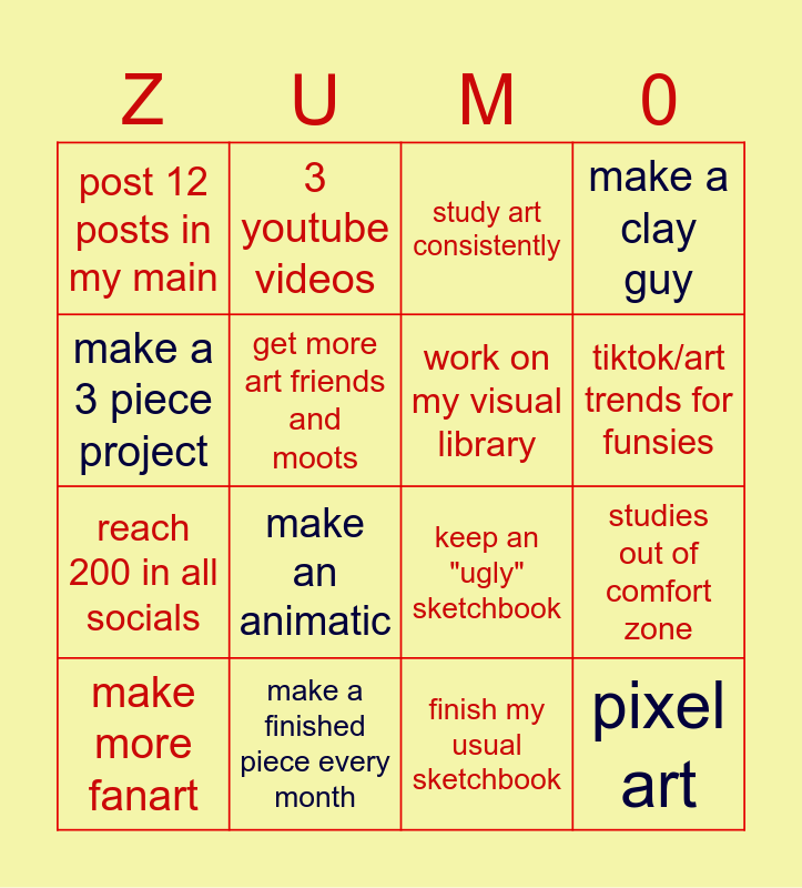 This bingo card has 16 words: make a finished piece every month, studies out of comfort zone, study art consistently, post 12 posts in my main, reach 200 in all socials, 3 youtube videos, keep an "ugly" sketchbook, finish my usual sketchbook, make a 3 piece project, get more art friends and moots, make more fanart, make a clay guy, make an animatic, tiktok/art trends for funsies, work on my visual library and pixel art.