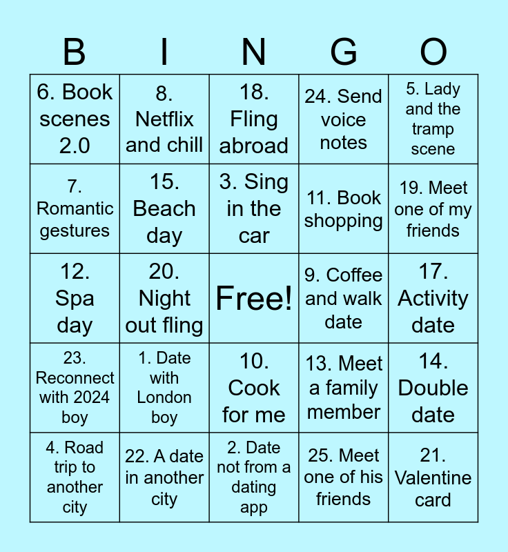 This bingo card has a free space and 25 words: 1. Date with London boy, 2. Date not from a dating app, 3. Sing in the car, 4. Road trip to another city, 5. Lady and the tramp scene, 6. Book scenes 2.0, 7. Romantic gestures, 8. Netflix and chill, 9. Coffee and walk date, 10. Cook for me, 11. Book shopping, 12. Spa day, 13. Meet a family member, 14. Double date, 15. Beach day, 16. Thai food date, 17. Activity date, 18. Fling abroad, 19. Meet one of my friends, 20. Night out fling, 21. Valentine card, 22. A date in another city, 23. Reconnect with 2024 boy, 24. Send voice notes and 25. Meet one of his friends.