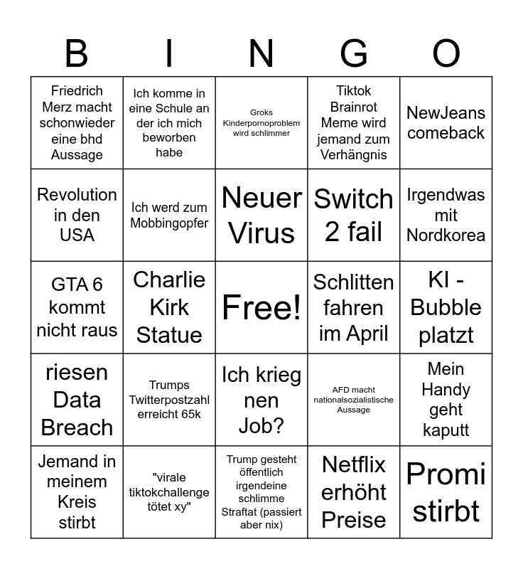 This bingo card has a free space and 24 words: Trumps Twitterpostzahl erreicht 65k, "virale tiktokchallenge tötet xy", Neuer Virus, Jemand in meinem Kreis stirbt, NewJeans comeback, Friedrich Merz macht schonwieder eine bhd Aussage, Revolution in den USA, Ich komme in eine Schule an der ich mich beworben habe, Schlitten fahren im April, Ich krieg nen Job?, Switch 2 fail, GTA 6 kommt nicht raus, AFD macht nationalsozialistische Aussage, Mein Handy geht kaputt, Ich werd zum Mobbingopfer, Netflix erhöht Preise, KI - Bubble platzt, Groks Kinderpornoproblem wird schlimmer, Irgendwas mit Nordkorea, Charlie Kirk Statue, Promi stirbt, riesen Data Breach, Tiktok Brainrot Meme wird jemand zum Verhängnis and Trump gesteht öffentlich irgendeine schlimme Straftat (passiert aber nix).