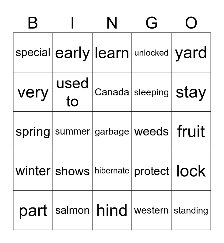 This bingo card has a free space and 24 words: part, shows, Canada, western, yard, special, early, learn, weeds, fruit, spring, used to, protect, lock, very, salmon, hind, unlocked, stay, winter, summer, hibernate, sleeping and standing.