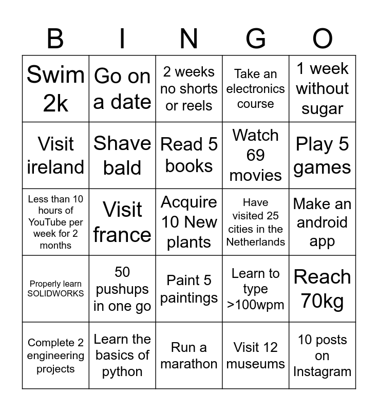 This bingo card has 25 words: 50 pushups in one go, Run a marathon, Read 5 books, Complete 2 engineering projects, 1 week without sugar, Swim 2k, Visit ireland, Go on a date, Have visited 25 cities in the Netherlands, Paint 5 paintings, Watch 69 movies, Less than 10 hours of YouTube per week for 2 months, Learn to type >100wpm, Reach 70kg, Shave bald, 10 posts on Instagram, Make an android app, 2 weeks no shorts or reels, Play 5 games, Visit france, Acquire 10 New plants, Learn the basics of python, Properly learn SOLIDWORKS, Take an electronics course and Visit 12 museums.