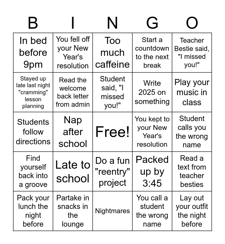 This bingo card has a free space and 24 words: Late to school, Partake in snacks in the lounge, Student said, "I missed you!", Pack your lunch the night before, Teacher Bestie said, "I missed you!", In bed before 9pm, Stayed up late last night "cramming" lesson planning, You fell off your New Year's resolution, You kept to your New Year's resolution, Do a fun "reentry" project, Write 2025 on something, Students follow directions, Packed up by 3:45, Read a text from teacher besties, Read the welcome back letter from admin, You call a student the wrong name, Student calls you the wrong name, Too much caffeine, Play your music in class, Nap after school, Lay out your outfit the night before, Find yourself back into a groove, Start a countdown to the next break and Nightmares.