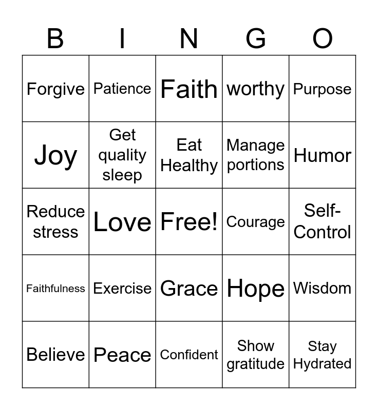 This bingo card has a free space and 24 words: Exercise, Peace, Eat Healthy, Believe, Purpose, Forgive, Joy, Patience, Courage, Grace, Manage portions, Reduce stress, Hope, Wisdom, Get quality sleep, Show gratitude, Self-Control, Faith, Humor, Love, Stay Hydrated, Faithfulness, worthy and Confident.