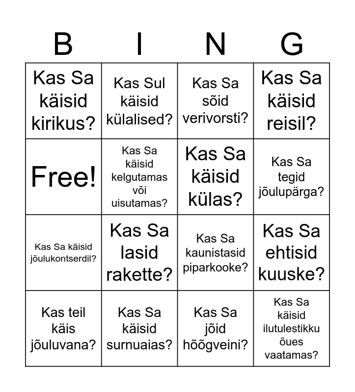 This bingo card has 16 words: Kas Sa käisid surnuaias?, Kas Sa ehtisid kuuske?, Kas Sa sõid verivorsti?, Kas Sa käisid kirikus?, Kas Sa käisid jõulukontserdil?, Kas Sul käisid külalised?, Kas Sa kaunistasid piparkooke?, Kas Sa jõid hõõgveini?, Free!, Kas Sa käisid kelgutamas või uisutamas?, Kas teil käis jõuluvana?, Kas Sa käisid reisil?, Kas Sa lasid rakette?, Kas Sa tegid jõulupärga?, Kas Sa käisid külas? and Kas Sa käisid ilutulestikku õues vaatamas?.