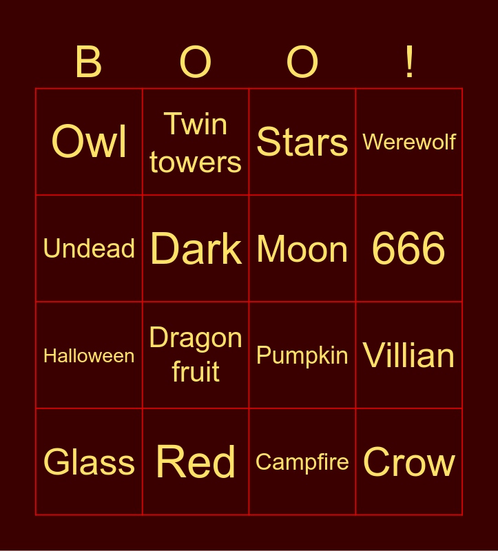 This bingo card has 26 words: Free!, Bat, 666, Cloud, Undead, Owl, Dark, Twin towers, Campfire, Shade, Halloween, Pumpkin, Maine, Queen, Villian, Darkness, Werewolf, Crow, Stars, Glass, Dragon fruit, Fear, Red, Gold, Moon and Knife.