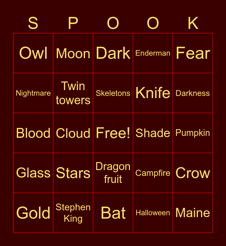 This bingo card has a free space and 31 words: Bat, 666, Cloud, Undead, Owl, Dark, Twin towers, Campfire, Shade, Halloween, Pumpkin, Maine, Queen, Villian, Darkness, Werewolf, Crow, Stars, Glass, Dragon fruit, Fear, Red, Gold, Moon, Knife, Nightmare, Enderman, Blood, Stephen King, Skeletons and Heart.
