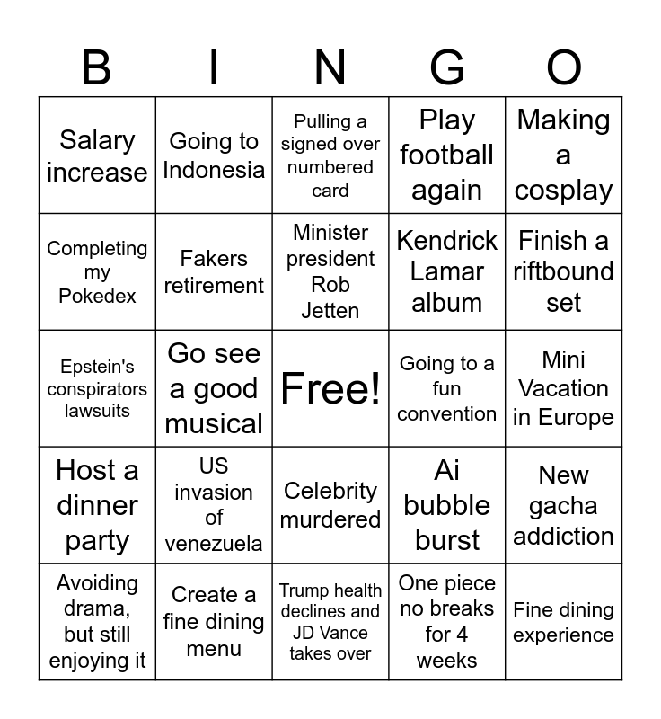 This bingo card has a free space and 25 words: US invasion of venezuela, Trump health declines and JD Vance takes over, Minister president Rob Jetten, Avoiding drama, but still enjoying it, Making a cosplay, Salary increase, Completing my Pokedex, Going to Indonesia, Going to a fun convention, Celebrity murdered, Kendrick Lamar album, Epstein's conspirators lawsuits, Ai bubble burst, New gacha addiction, Fakers retirement, House prices crash, Mini Vacation in Europe, Pulling a signed over numbered card, Finish a riftbound set, Go see a good musical, Fine dining experience, Create a fine dining menu, Host a dinner party, Play football again and One piece no breaks for 4 weeks.
