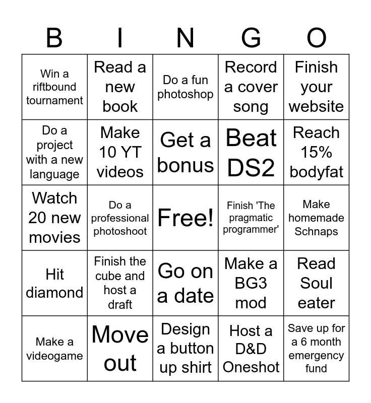 This bingo card has a free space and 24 words: Finish the cube and host a draft, Move out, Get a bonus, Make a videogame, Finish your website, Win a riftbound tournament, Do a project with a new language, Read a new book, Finish 'The pragmatic programmer', Go on a date, Beat DS2, Watch 20 new movies, Make a BG3 mod, Read Soul eater, Make 10 YT videos, Host a D&D Oneshot, Make homemade Schnaps, Do a fun photoshop, Reach 15% bodyfat, Do a professional photoshoot, Save up for a 6 month emergency fund, Hit diamond, Record a cover song and Design a button up shirt.