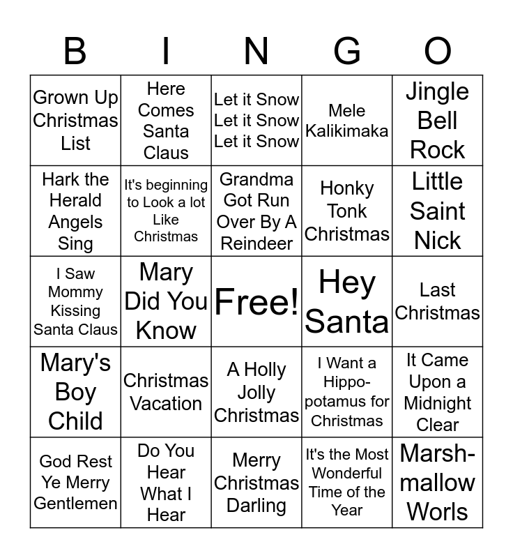 This bingo card has a free space and 24 words: Christmas Vacation, Do You Hear What I Hear, Grandma Got Run Over By A Reindeer, God Rest Ye Merry Gentlemen, Jingle Bell Rock, Grown Up Christmas List, Hark the Herald Angels Sing, Here Comes Santa Claus, Hey Santa, A Holly Jolly Christmas, Honky Tonk Christmas, I Saw Mommy Kissing Santa Claus, I Want a Hippo- potamus for Christmas, It Came Upon a Midnight Clear, It's beginning to Look a lot Like Christmas, It's the Most Wonderful Time of the Year, Last Christmas, Let it Snow Let it Snow Let it Snow, Little Saint Nick, Mary Did You Know, Marsh-mallow Worls, Mary's Boy Child, Mele Kalikimaka and Merry Christmas Darling.