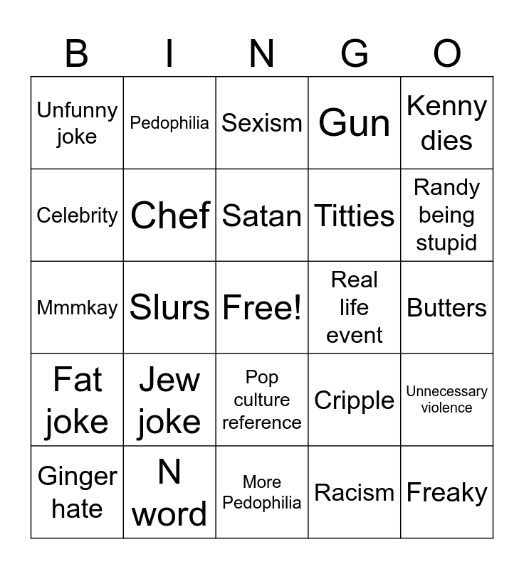 This bingo card has a free space and 24 words: Jew joke, N word, Satan, Ginger hate, Kenny dies, Unfunny joke, Celebrity, Pedophilia, Real life event, Pop culture reference, Titties, Mmmkay, Cripple, Unnecessary violence, Chef, Racism, Butters, Sexism, Randy being stupid, Slurs, Freaky, Fat joke, Gun and More Pedophilia.