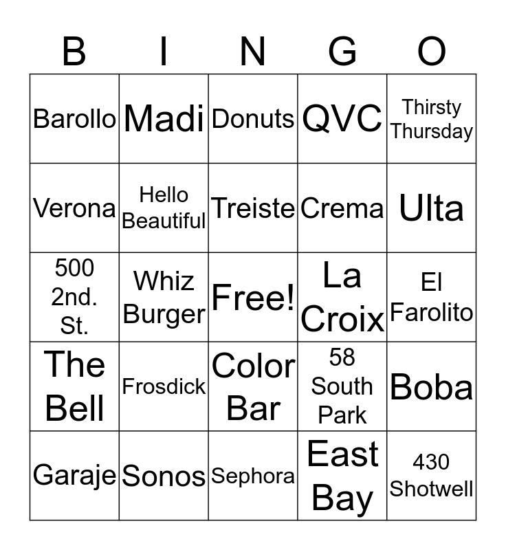 This bingo card has a free space and 24 words: Frosdick, Sonos, Treiste, Garaje, Thirsty Thursday, Barollo, Verona, Madi, La Croix, Color Bar, Crema, 500 2nd. St., 58 South Park, Boba, Hello Beautiful, East Bay, El Farolito, Donuts, Ulta, Whiz Burger, 430 Shotwell, The Bell, QVC and Sephora.