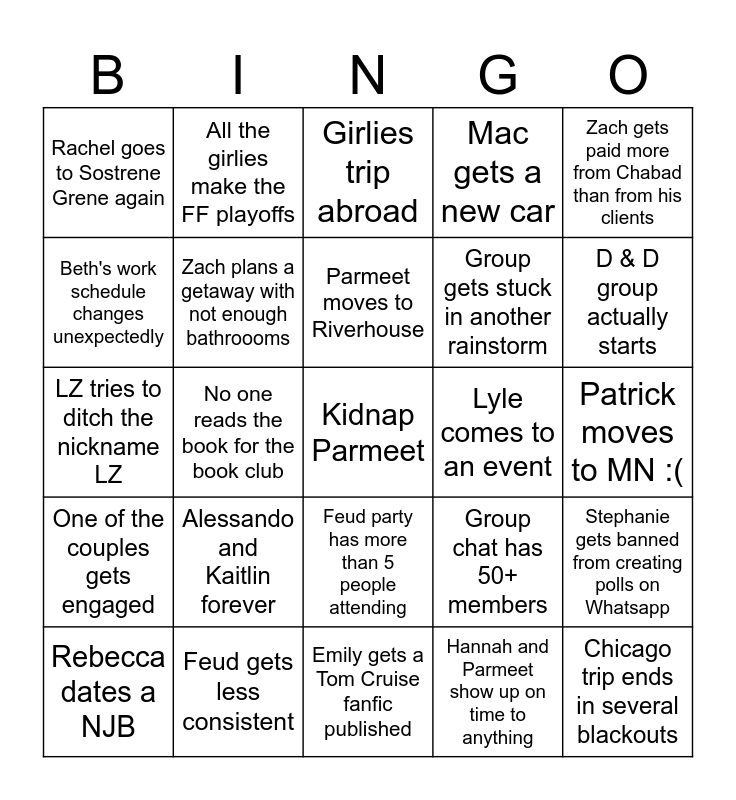 This bingo card has a free space and 24 words: Alessando and Kaitlin forever, Feud gets less consistent, Parmeet moves to Riverhouse, Rebecca dates a NJB, Zach gets paid more from Chabad than from his clients, Rachel goes to Sostrene Grene again, Beth's work schedule changes unexpectedly, All the girlies make the FF playoffs, Lyle comes to an event, Feud party has more than 5 people attending, Group gets stuck in another rainstorm, LZ tries to ditch the nickname LZ, Group chat has 50+ members, Stephanie gets banned from creating polls on Whatsapp, Zach plans a getaway with not enough bathroooms, Hannah and Parmeet show up on time to anything, Patrick moves to MN :(, Girlies trip abroad, D & D group actually starts, No one reads the book for the book club, Chicago trip ends in several blackouts, One of the couples gets engaged, Mac gets a new car and Emily gets a Tom Cruise fanfic published.