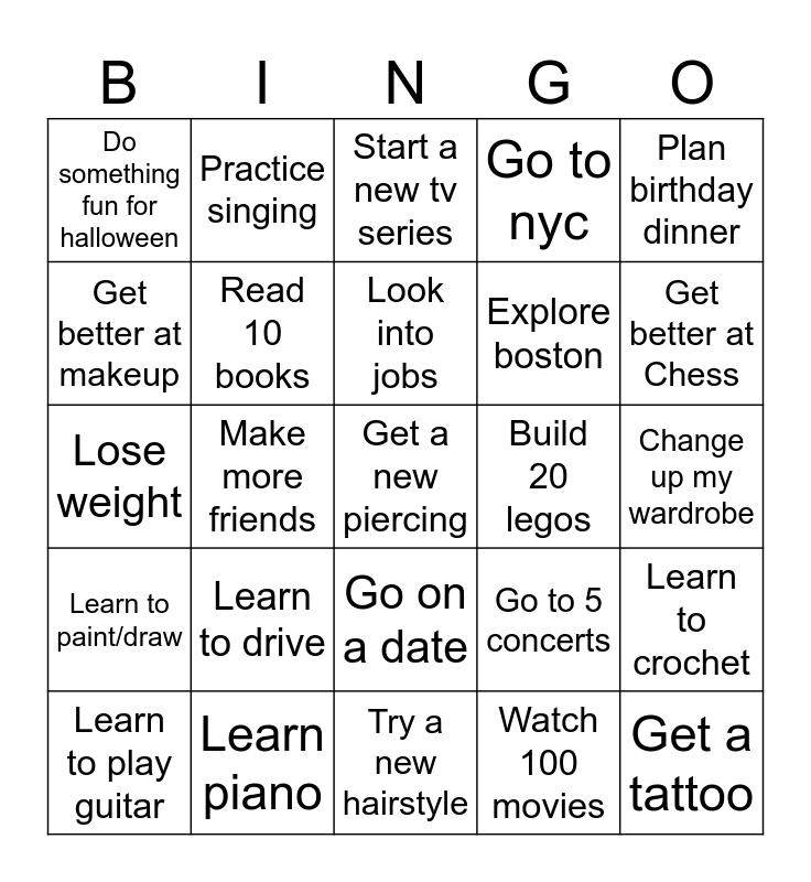 This bingo card has a free space and 24 words: Learn to drive, Learn piano, Look into jobs, Learn to play guitar, Plan birthday dinner, Do something fun for halloween, Get better at makeup, Practice singing, Build 20 legos, Go on a date, Explore boston, Lose weight, Go to 5 concerts, Learn to crochet, Read 10 books, Watch 100 movies, Change up my wardrobe, Start a new tv series, Get better at Chess, Make more friends, Get a tattoo, Learn to paint/draw, Go to nyc and Try a new hairstyle.