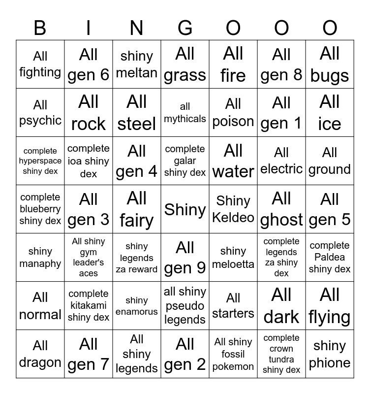 This bingo card has a free space and 48 words: All starters, All gen 1, All gen 2, All gen 3, All gen 4, All gen 5, All gen 6, All gen 7, All gen 8, All gen 9, All bugs, All grass, All electric, All water, All normal, All ghost, All psychic, All ice, All dark, All fire, All poison, All fairy, All fighting, All rock, All flying, All steel, All ground, All dragon, complete galar shiny dex, complete ioa shiny dex, complete crown tundra shiny dex, Shiny Keldeo, complete Paldea shiny dex, complete kitakami shiny dex, complete blueberry shiny dex, shiny meloetta, complete legends za shiny dex, complete hyperspace shiny dex, shiny legends za reward, shiny enamorus, shiny manaphy, shiny phione, shiny meltan, All shiny legends, all mythicals, all shiny pseudo legends, All shiny gym leader's aces and All shiny fossil pokemon.