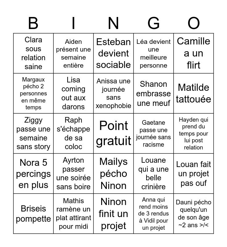 This bingo card has a free space and 24 words: Briseis pompette, Ayrton passer une soirée sans boire, Anissa une journée sans xenophobie, Anna qui rend moins de 3 rendus à Vidil pour un projet, Camille a un flirt, Clara sous relation saine, Aiden présent une semaine entière, Esteban devient sociable, Gaetane passe une journée sans racisme, Hayden qui prend du temps pour lui post relation, Ziggy passe une semaine sans story, Lisa coming out aux darons, Louane qui a une belle crinière, Louan fait un projet pas ouf, Margaux pécho 2 personnes en même temps, Mathis ramène un plat attirant pour midi, Ninon finit un projet, Léa devient une meilleure personne, Matilde tattouée, Nora 5 percings en plus, Raph s'échappe de sa coloc, Mailys pécho Ninon, Shanon embrasse une meuf and Dauni pécho quelqu'un de son âge ~2 ans >/<.