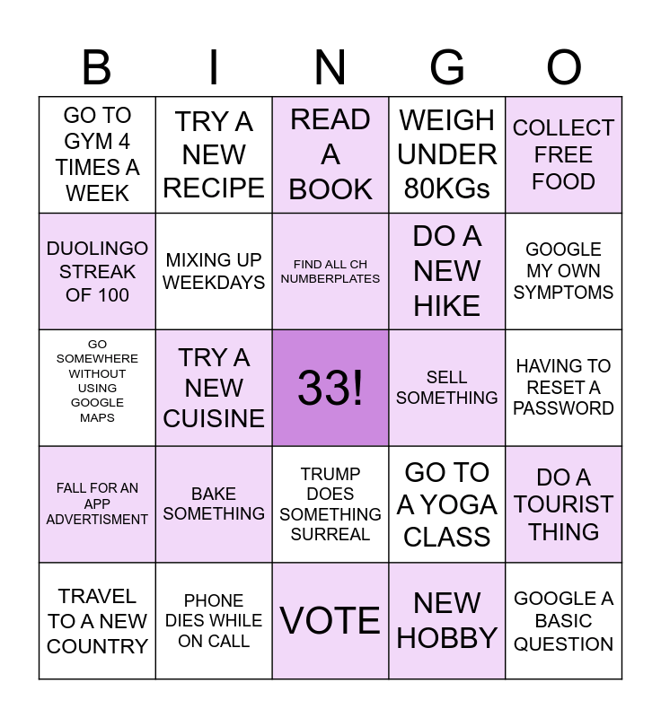 This bingo card has a free space and 24 words: BAKE SOMETHING, PHONE DIES WHILE ON CALL, FIND ALL CH NUMBERPLATES, TRAVEL TO A NEW COUNTRY, COLLECT FREE FOOD, GO TO GYM 4 TIMES A WEEK, DUOLINGO STREAK OF 100, TRY A NEW RECIPE, SELL SOMETHING, TRUMP DOES SOMETHING SURREAL, DO A NEW HIKE, GO SOMEWHERE WITHOUT USING GOOGLE MAPS, GO TO A YOGA CLASS, DO A TOURIST THING, MIXING UP WEEKDAYS, NEW HOBBY, HAVING TO RESET A PASSWORD, READ A BOOK, GOOGLE MY OWN SYMPTOMS, TRY A NEW CUISINE, GOOGLE A BASIC QUESTION, FALL FOR AN APP ADVERTISMENT, WEIGH UNDER 80KGs and VOTE.