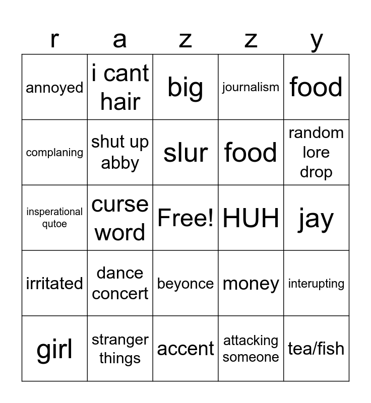 This bingo card has a free space and 24 words: dance concert, stranger things, slur, girl, food, annoyed, complaning, i cant hair, HUH, beyonce, food, insperational qutoe, money, interupting, shut up abby, attacking someone, jay, big, random lore drop, curse word, tea/fish, irritated, journalism and accent.