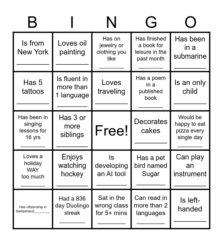 This bingo card has a free space and 24 words: Enjoys watching hockey ________, Had a 836 day Duolingo streak ________, Loves traveling ________, Has citizenship in Switzerland________, Has been in a submarine ________, Is from New York ________, Has 5 tattoos ________, Loves oil painting ________, Decorates cakes ________, Is developing an AI tool ________, Has a poem in a published book ________, Has been in singing lessons for 16 yrs ________, Has a pet bird named Sugar ________, Can play an instrument ________, Is fluent in more than 1 language ________, Can read in more than 2 languages ________, Would be happy to eat pizza every single day ________, Has on jewelry or clothing you like ________, Is an only child ________, Has 3 or more siblings ________, Is left-handed ________, Loves a holiday WAY too much ________, Has finished a book for leisure in the past month ________ and Sat in the wrong class for 5+ mins ________.